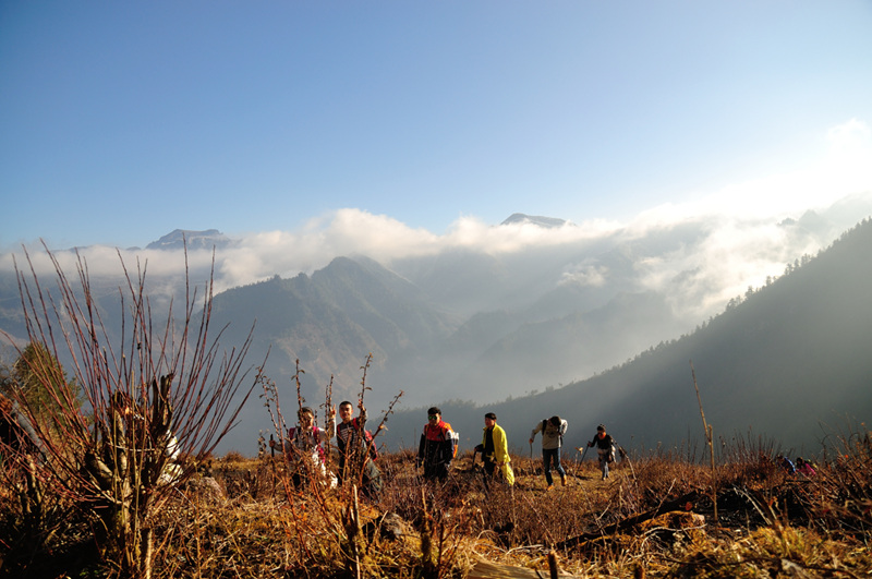 早起看日出、云海、云瀑、大家還可以輕裝上陣繼續徒步1小時左右(需6點起床)。最好的風景在高處。9.30大家下山,村子里解決午餐后返程。