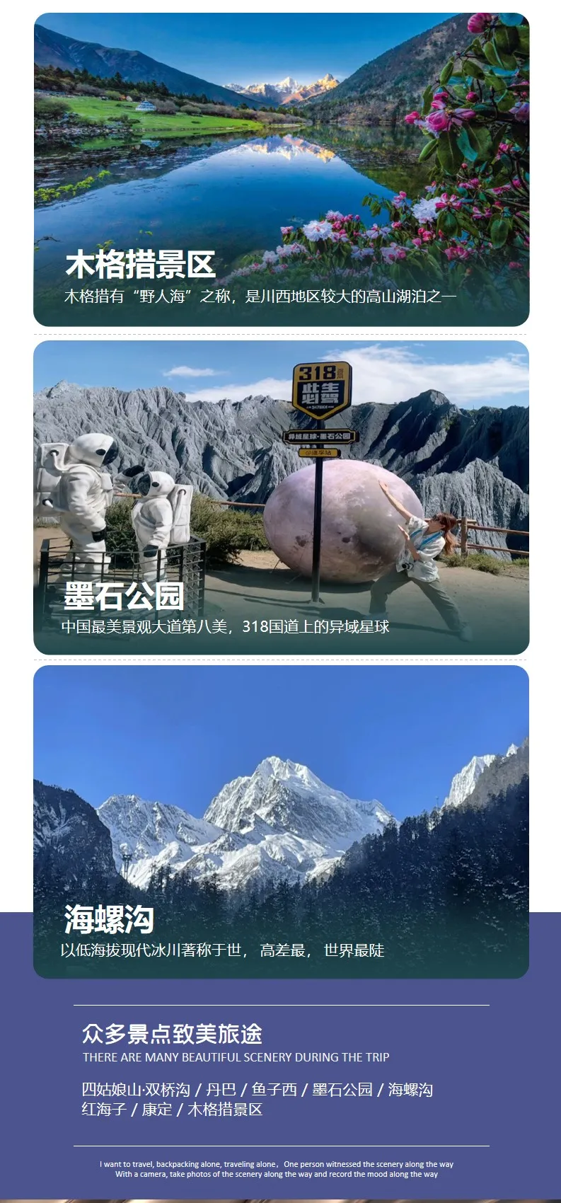 3、門票:景區門票、觀光車、電瓶車、索道、纜車、騎馬等敬請自理,景點門票根據自愿,考慮是否前往自理;可能涉及到的門票費用:紅海子清潔費20/人、斯丁措清潔費20/人、塔公草原門票費30/人、墨石公園門票+觀光車80/人、海螺溝門票+觀光車115/人、海螺溝景區往返索道135/人、魚子西清潔費20元/人、前往魚子西需自理中轉車費60元/人,,原車前往同樣需自理該費用;木格措觀光車90/人、四姑娘山門票+觀光車約150/人;(如有上述未列到門票費,請以實際行程為準,如符合門票優惠政策,請攜帶有效相關證件。)