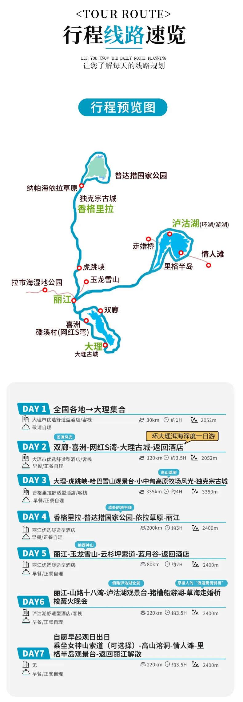 自愿早起觀日出日---乘坐女神山索道(可選擇)---高山溶洞---情人灘---里格半島觀景臺---返回麗江解散(約220km 車程:約3.5H)