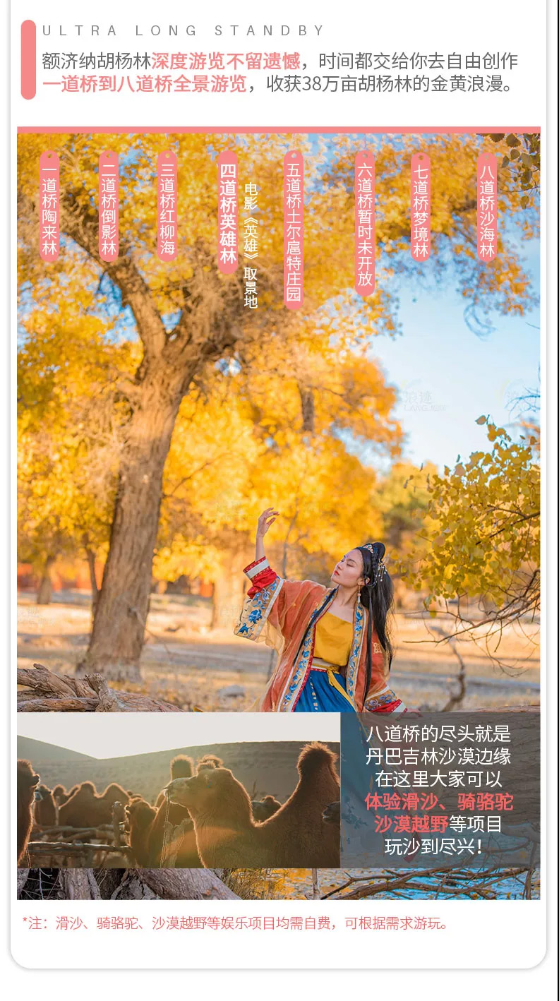 3. 額濟納金秋盛宴每年只有一個月的賞味期,全國各地的游客蜂擁而至,小鎮(zhèn)各項資源過載,當?shù)夭粩嗤晟破渑涮踪Y源但基礎(chǔ)設(shè)置仍較薄弱,請大家以平常心對待。