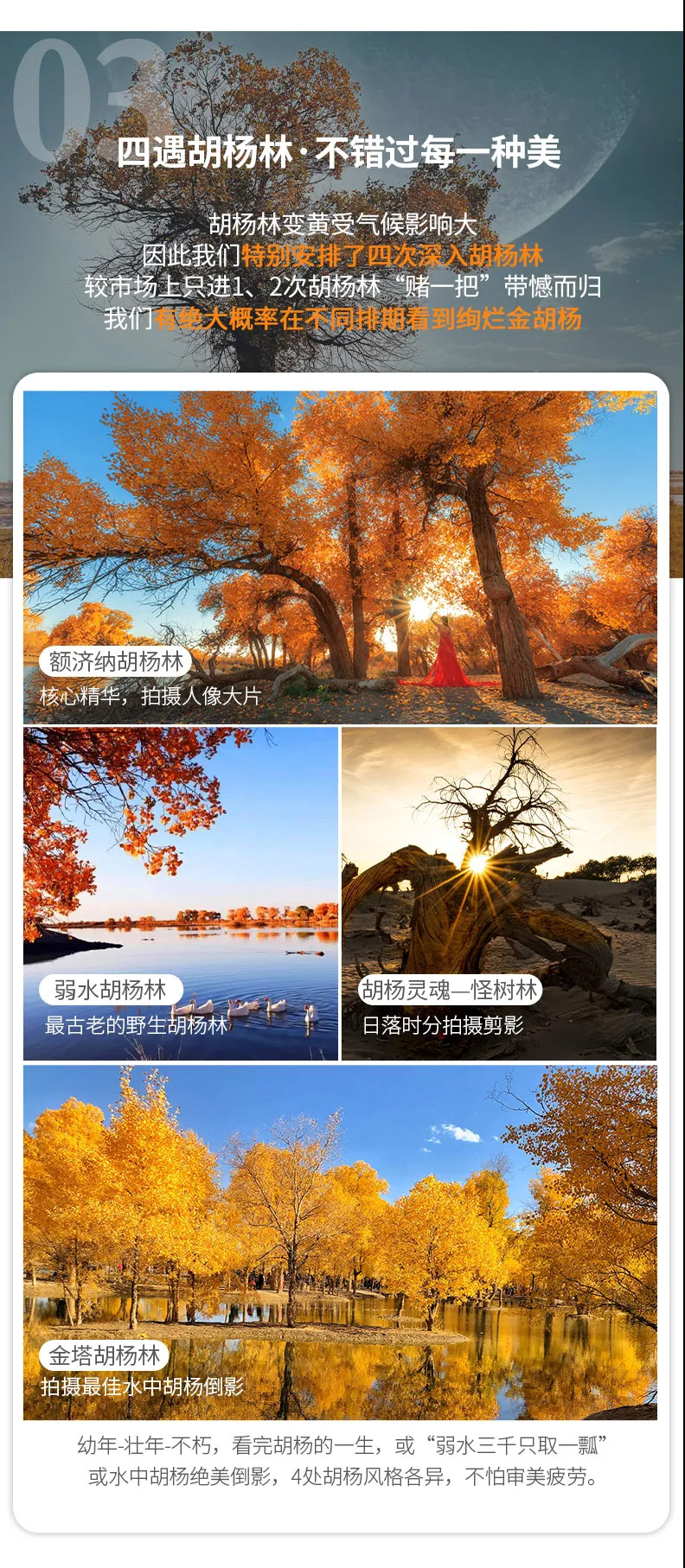 在額濟納旗胡楊林核心景區(qū),我們還精心安排了駐地專業(yè)攝影師旅拍,每人至少3張旅拍精修電子大圖,將這絕美秋色與最美的你定格永存。