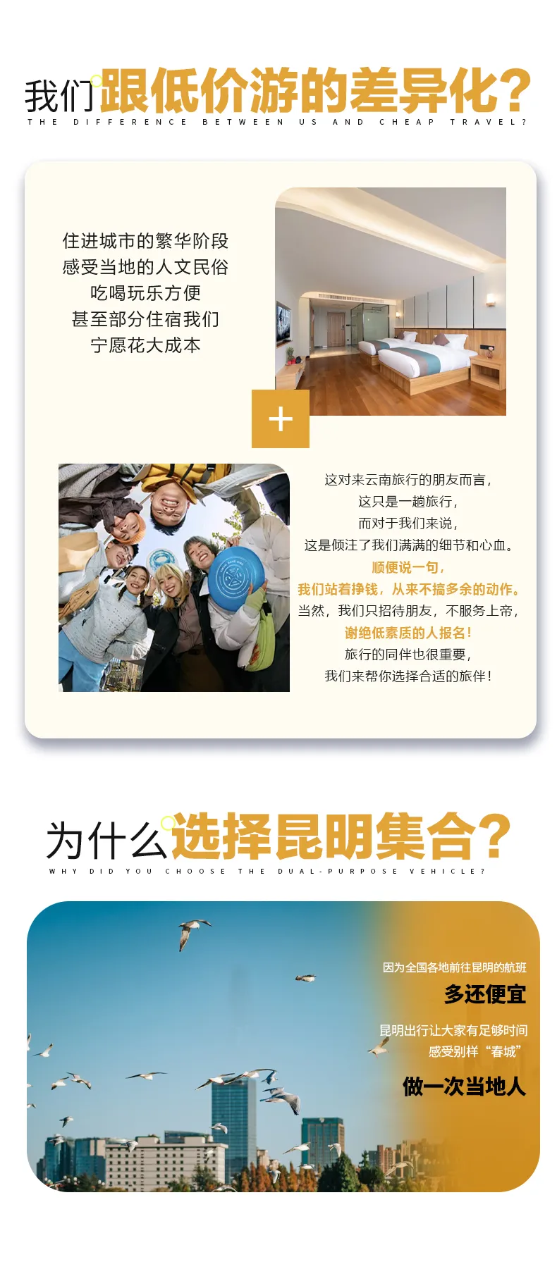 1、交通:不包含各地到達(dá)昆明集散的往返大交通費(fèi)用(如:機(jī)票和高鐵火車票等,提前預(yù)定通常折扣都會(huì)很低);