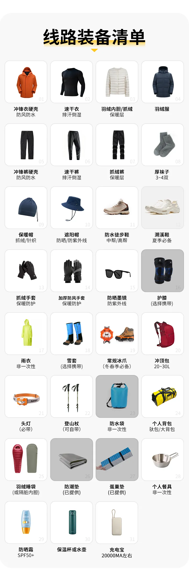 16.本次活動所到達的地區溫差較大。夏季白天溫度(晴天)可達25℃左右,夜間溫度可能低至0℃以下,請大家注意攜帶保暖衣物,并請選擇舒適溫標不低于零下10℃左右睡袋。高原紫外線強烈,請準備防曬用品。