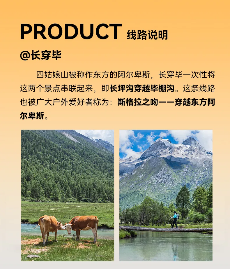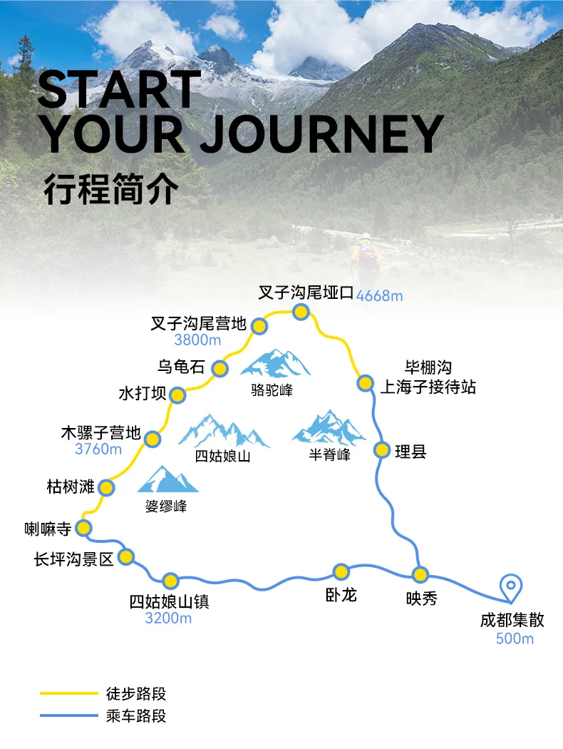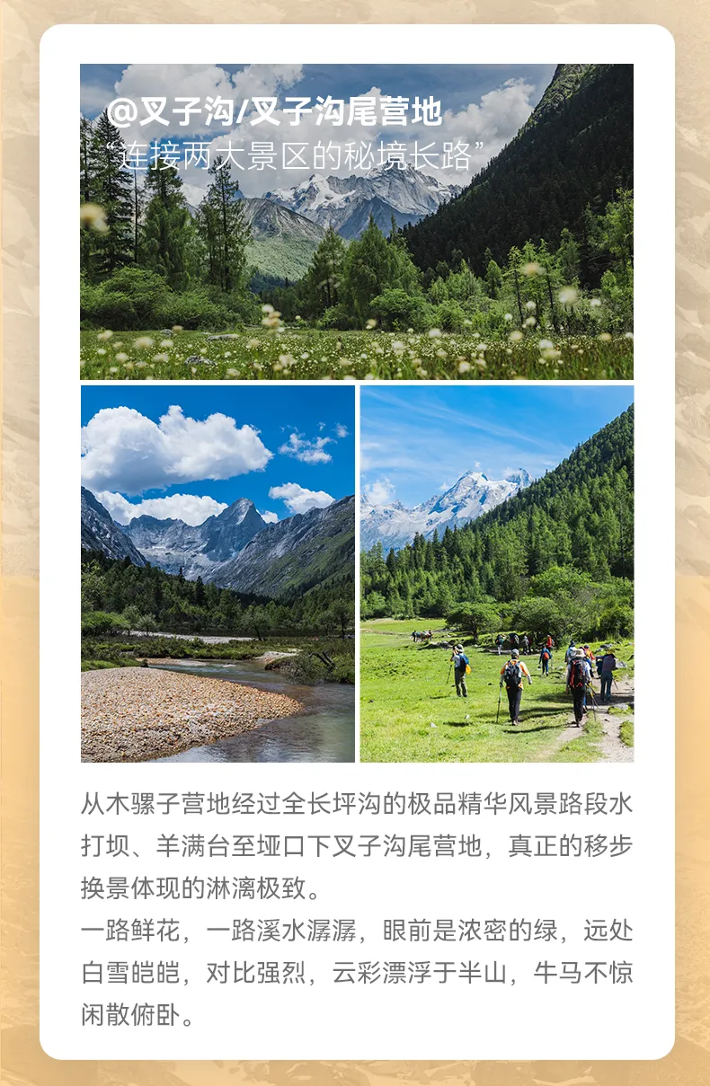 溫馨提示:叉子溝尾營地——木騾子營地這一段路程可選擇騎馬(馬匹數量有限,且此舉為自愿選擇項目,費用自行與當地馬夫協商,安全責任自行負責)
