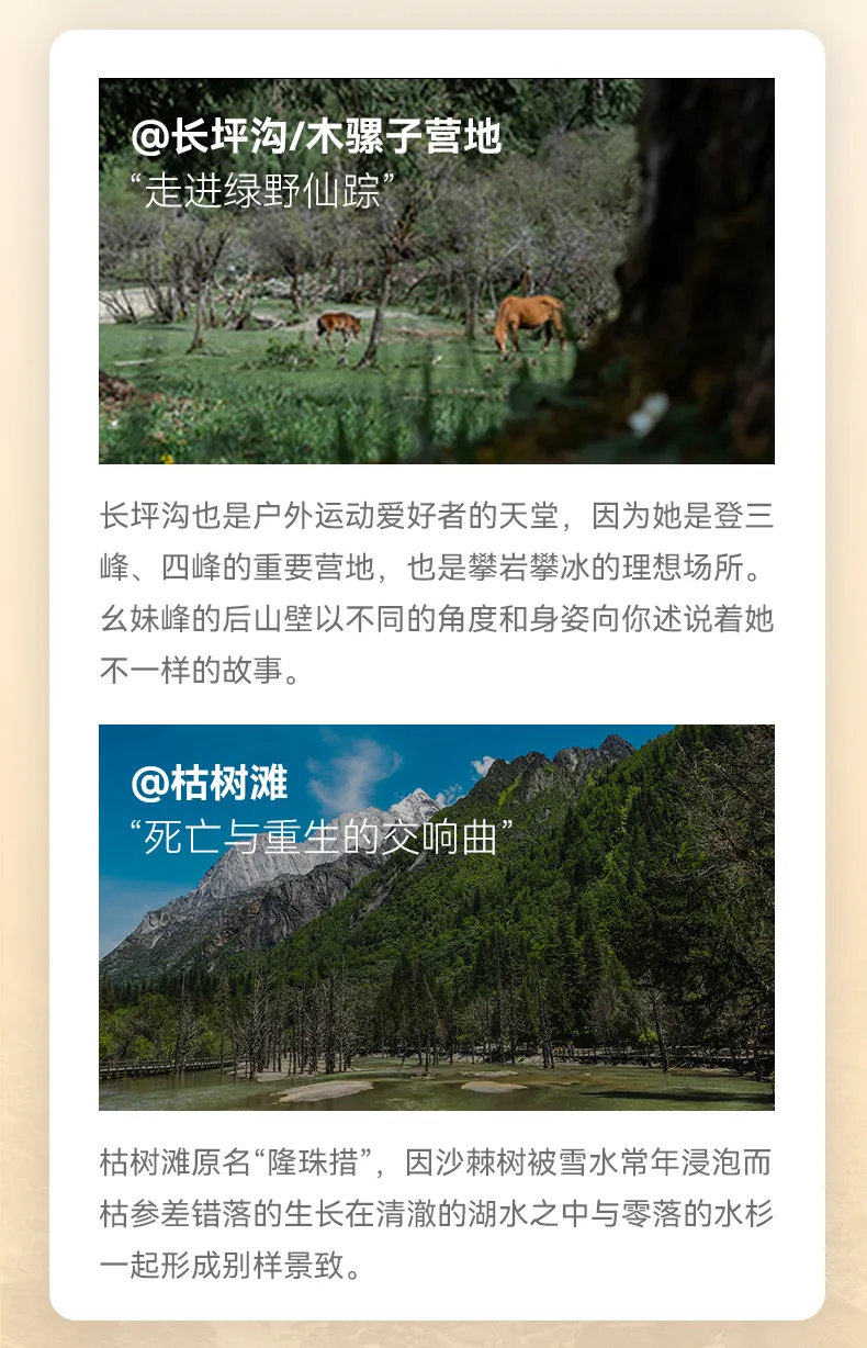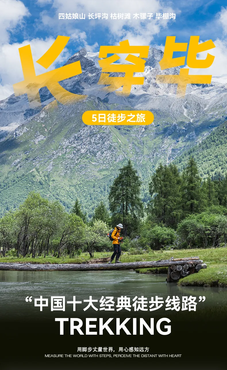 早餐后乘觀光車進入長坪溝,抵達喇嘛寺,開始我們為期三天的徒步穿越行程,長坪溝全長29公里,峽谷長天、平緩悠長,長坪溝景區內有古柏幽道、干海子、飛瀑奇石之景。夏天,山野間鮮花爭相盛開;秋日,赤樺與紅楓競艷。歷經滄桑的翠柏青松郁郁蔥蔥,飛瀑流泉在密林中嘩嘩作響,古代驛路在茫茫林海里穿梭延伸...今天晚上在四姑娘山幺妹峰腳下的木騾子營地露營。