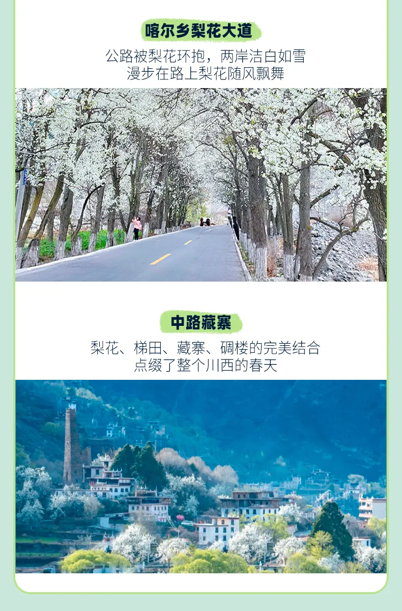 ?早上從成都酒店出發,沿岷江而上,沿途車覽紫坪埔水利工程、地震遺址,經汶川抵達【桃坪羌寨】游玩,然后繼續行車,經理縣、穿鷓鴣山隧道駛進秀美修長的梭磨河峽谷,抵達馬爾康【西索民居】,感受濃厚的藏族土司文化,繼續前行,沿途觀賞川西田園風光,不知不覺,空氣里已彌漫著梨花的氣息,越接近【金川】,梨花越多,公路旁、山坡上、河灘邊梨花爭先恐后地怒放著,如果時間尚早,我們可以停車休息拍照,領略金川河谷的秀美景色,傍晚到達金川縣入住。