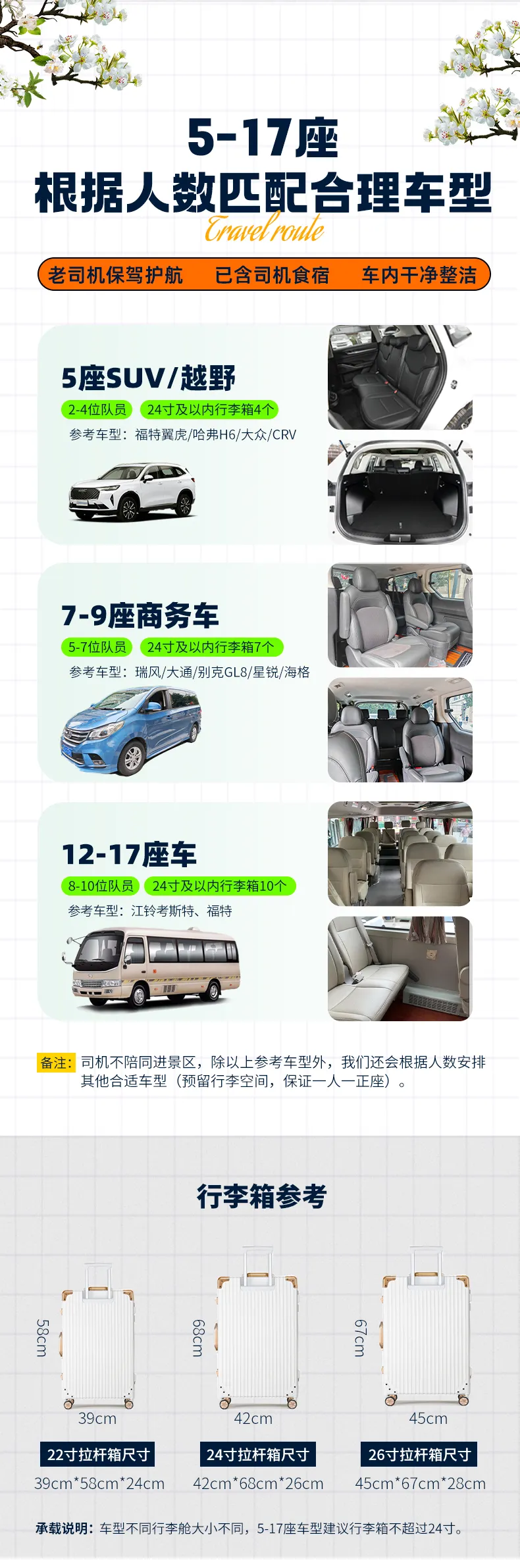 1、交通:根據人數確定車輛(全程司機兼向導,已含駕駛員食宿,駕駛員熟悉線路,會給隊員提供行程建議,全程邊走邊玩,保證多次停車服務,但不會像專業導游一樣解說,且不陪同隊員進景區,請理解);