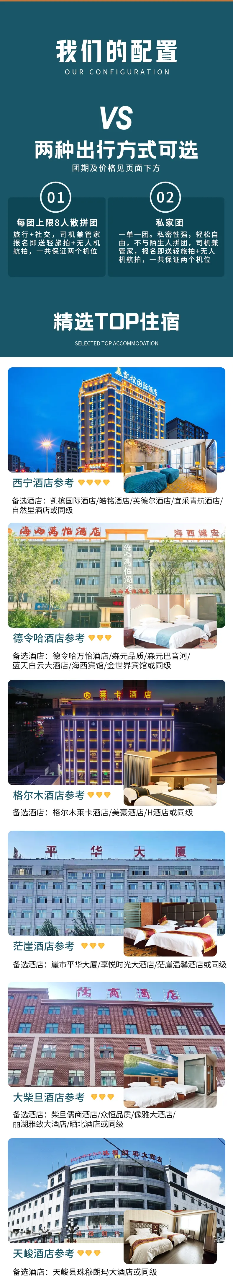 1、住宿:西寧市4鉆酒店標間1晚、德令哈市3鉆酒店標間1晚、格爾木市3鉆酒店標間2晚、茫崖3鉆酒店標間1晚、大柴旦鎮3鉆酒店標間1晚、天峻縣3鉆酒店標間1晚;