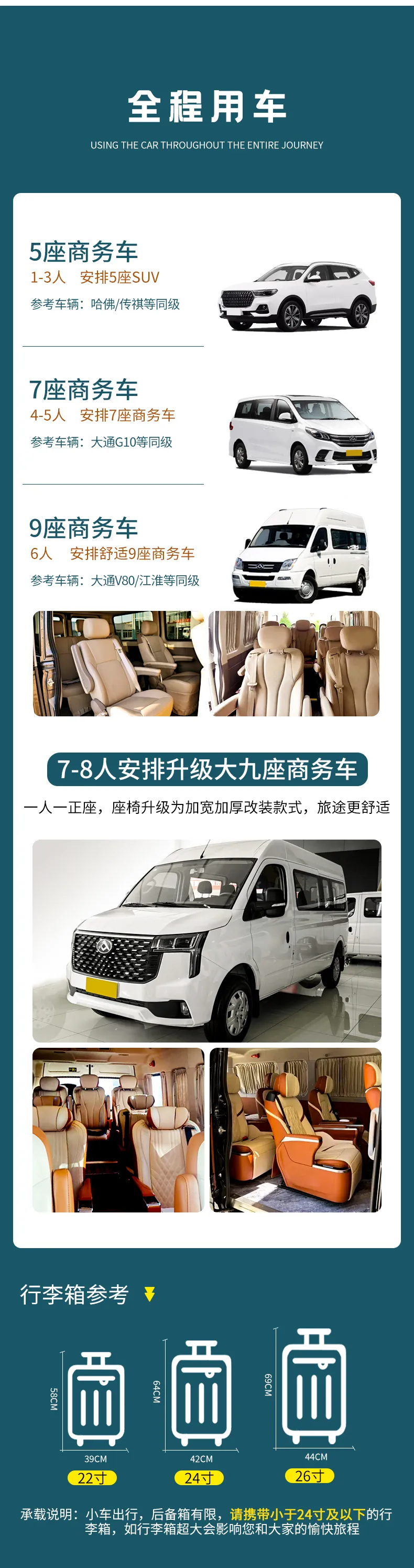 3、用車:2-3人用5座SUV,4-5人用7座商務車,6人用普通9座商務車,7-8人用改裝大九座商務車(小團副駕駛及前后座位置需要輪流乘坐,望悉知);