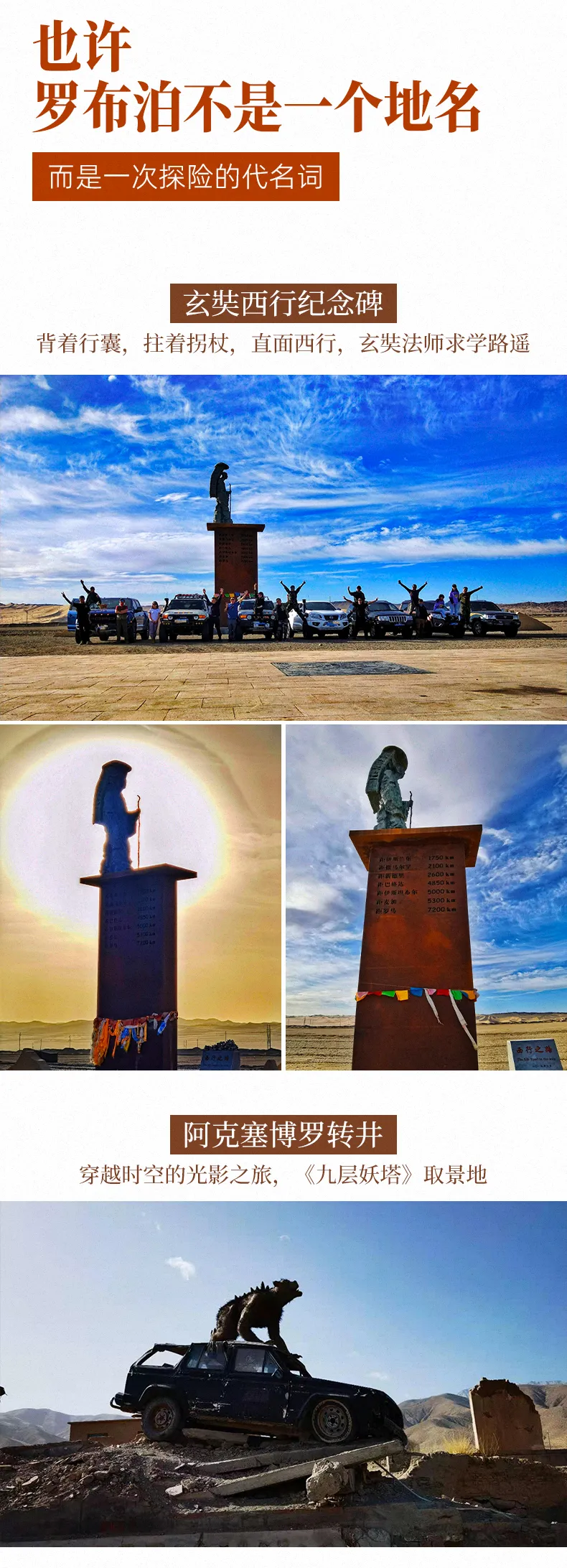 第一縷陽光灑在大漠中,追光者早已架起設備瘋狂捕捉,日出拍攝活動結束后,廚師早已為大家準備好熱騰騰的早餐。吃過早餐,開始新一天的征程,我們向“光”而行,感受薪火相傳的國家力量。彭加木,中國生物化學家、革命烈士,曾多次進入羅布泊開展科研工作,為中國的植物病毒研究做出了大量的貢獻。如今,他腳步最后消失的地方紀念碑已不復存在,但他的足跡仍舊停留于此?!九砑幽臼й櫦o念地】不是一處景點,而是心靈對話之地,國與家,奉獻與收獲。拜別了彭加木,我們趕往【一號科考紀念碑】,這是2003年中科院科考隊考察羅布泊時建立的第一個營地。我們繼續前行,去探秘沙漠中最像月球的地方【阿奇克谷地】。松軟的細沙、低矮的沙丘、平均風速最小、降雨量最小,是最適合實驗月球車的地方?!坝裢谩碧栐虑蜍囋谠卤黹_始漫步之前,已在這里行走一個月。如今我們還可以看到各種實驗殘骸,國家的力量在這里得以彰顯。一起去尋寶吧,在去往【天坑】的路上沿途分布著奇石灘涂,只要你有一雙發現美的眼睛,必能收獲屬于自己的奇石美玉,還有機會偶遇“恐龍蛋”哦,晚上我們便露營于此。