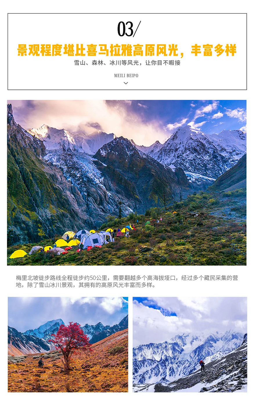 ?早上7點半起床,收拾帳篷和行裝,8點早餐后出發前往坡均營地。繼續沿著河谷前進,穿過一個大約3公里左右的原始森林,梅里雪山北坡主要山峰群就已經展現在眼前,再經過一個廢舊牛場,越過木橋,爬上山坡,奶日頂卡及其衍生冰川迎面而來。向著雪山繼續前進,很快便可到達坡均營地。營地正面就是梅里雪山北坡,奶日頂卡冰川、奶日頂卡、芒框臘卡等北坡主要山峰一覽無余。雪山冰川、白云藍天、河流草甸,還有悠然愜意的牦牛群,搭建好帳篷后,可以前往奶日貢卡冰川附近游玩拍照。今日全程無信號。