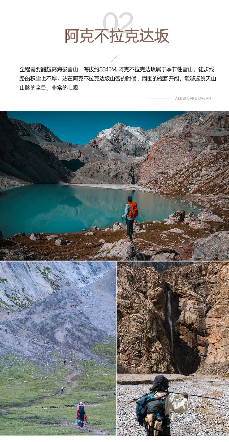 今天需翻越海拔3820米的阿克不拉克達坂頂。然后下行20公里,在博孜克日格河谷里扎營,海拔2300米左右。早晨早餐后出發,沿天堂湖邊棧道前行我們經過網紅打卡點老虎口,拍照過后我們翻越阿克布拉克達坂,阿克布拉克達坂是個急升雪達坂,很陡。