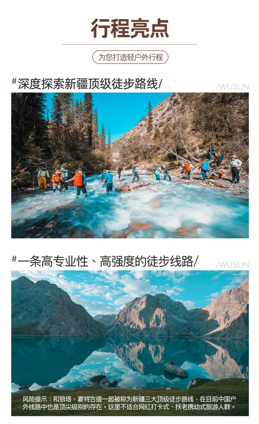 10、烏孫古道徒步穿越具有較大的風險,我們的領隊是多次帶隊烏孫古道,有一些甚至是每年6月到10月都在這條線上帶隊,具有良好和豐富的經驗,參與者在活動中務必聽從領隊的安排,以降低風險;