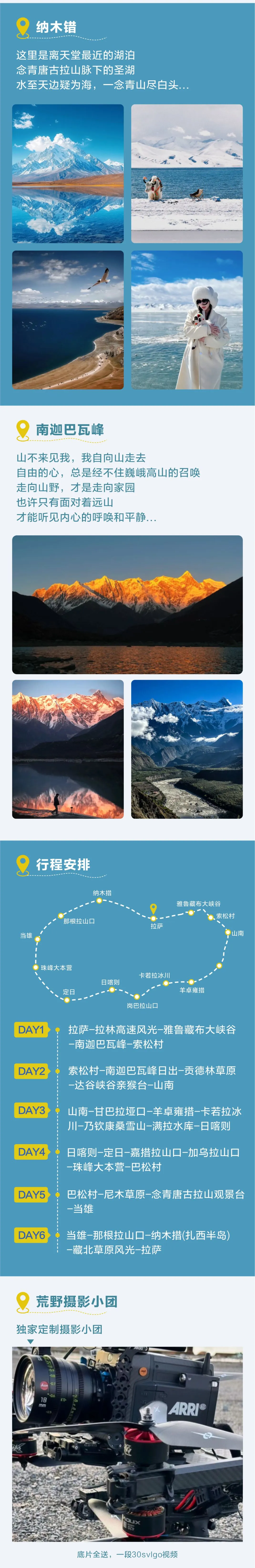 那根拉山口:海拔 5190 米,游玩時間 30 分鐘,這里是跨過念青唐古拉山脈去納木措的山間通道,從山口向措望去,遠遠可以看到碧藍碧藍的納木錯。納木措扎西半島景區:海拔 4718 米,往返乘坐觀光車+游玩時間 3 小時,扎西半島也叫吉祥愛情島,是納木措最大的半島,也是游覽納木措最重要的景點。納木措南面有終年積雪的念青唐古拉山,東南部是直插云宵、終年積雪的念青唐古拉山的主峰,北側倚偎著連綿的高原丘陵,廣闊的草原繞湖四周,天湖像一面巨大的寶鏡,鑲嵌在藏北的草原上。 隨后乘車返回拉薩,途徑藏北大草原,一路風景如畫,隨車隨停,看到好的風景,在條件允許的情況下,領隊都會停車休息讓您拍攝美照。抵達拉薩散團。