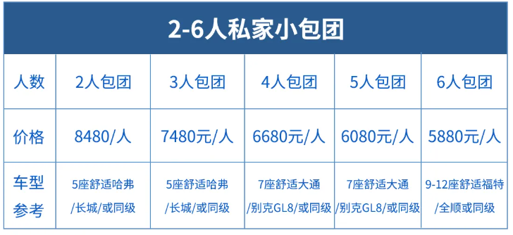若您的假期和以上排期不一致我們提供私家定制團可以隨時出發,國慶黃金周排期除外。私家小團都是司機兼職領隊,如需要安排領隊(平時領隊+500元/天+領隊食宿補助200元/天)