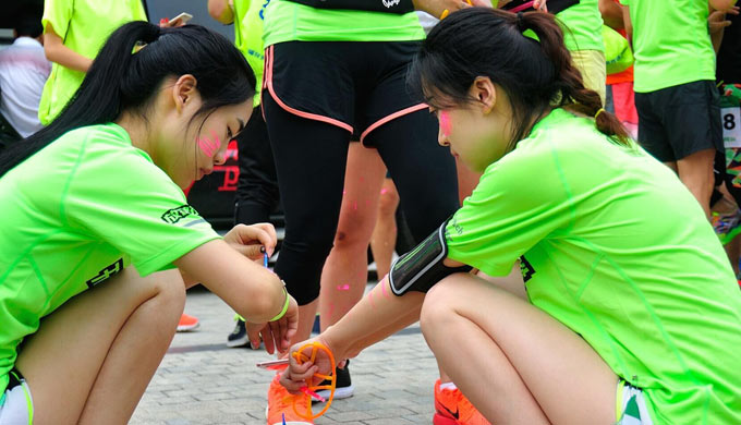 簽到后的跑友們,玩起了熒光DIY游戲,互相涂抹熒光粉、繪制熒光趣味圖案: