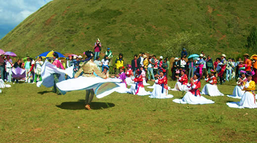 七月二十五日尤為隆重,這天是格姆女神祀日,即“格姆過”。盛裝的摩梭男女圍繞格姆山祭祀完畢后,便開始野餐。接著男女老少圍在一起跳甲搓舞、獅子舞、蕩秋千、賽馬、對(duì)歌等縱情歡樂,有興趣的還去結(jié)識(shí)姑娘們,以便日后結(jié)交阿肖。